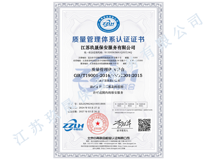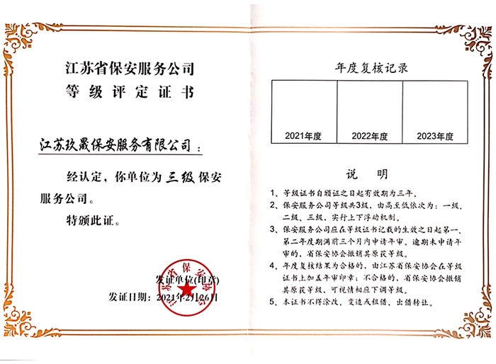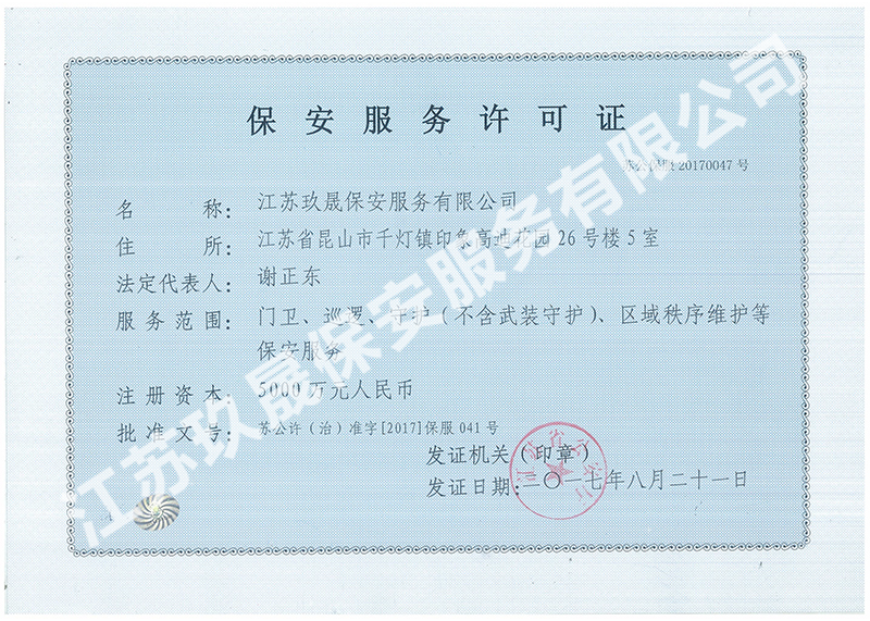 江蘇玖晟保安服務(wù)有限公司成立于江蘇省昆山市千燈鎮(zhèn)。注冊資金:5000萬,是擁有省公安廳頒發(fā)的保安服務(wù)許可證的企業(yè)【蘇公保服20170046】,也是昆山市保安協(xié)會常務(wù)理事單位。